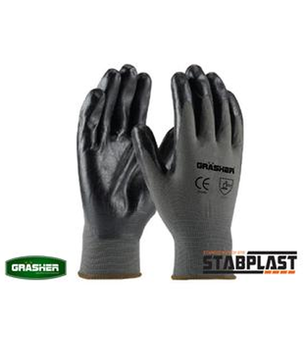 Γάντια εργασίας νιτριλίου γκρί-μαύρο GRASHER ανθεκτικά και ελαστικά, με αντιολισθητική επίστρωση κατάλληλα για πολύωρη χρήση προστατέυοντας το χέρι από υλικό το οποίο αναπνέει χωρίς το χέρι να ιδρώνει.